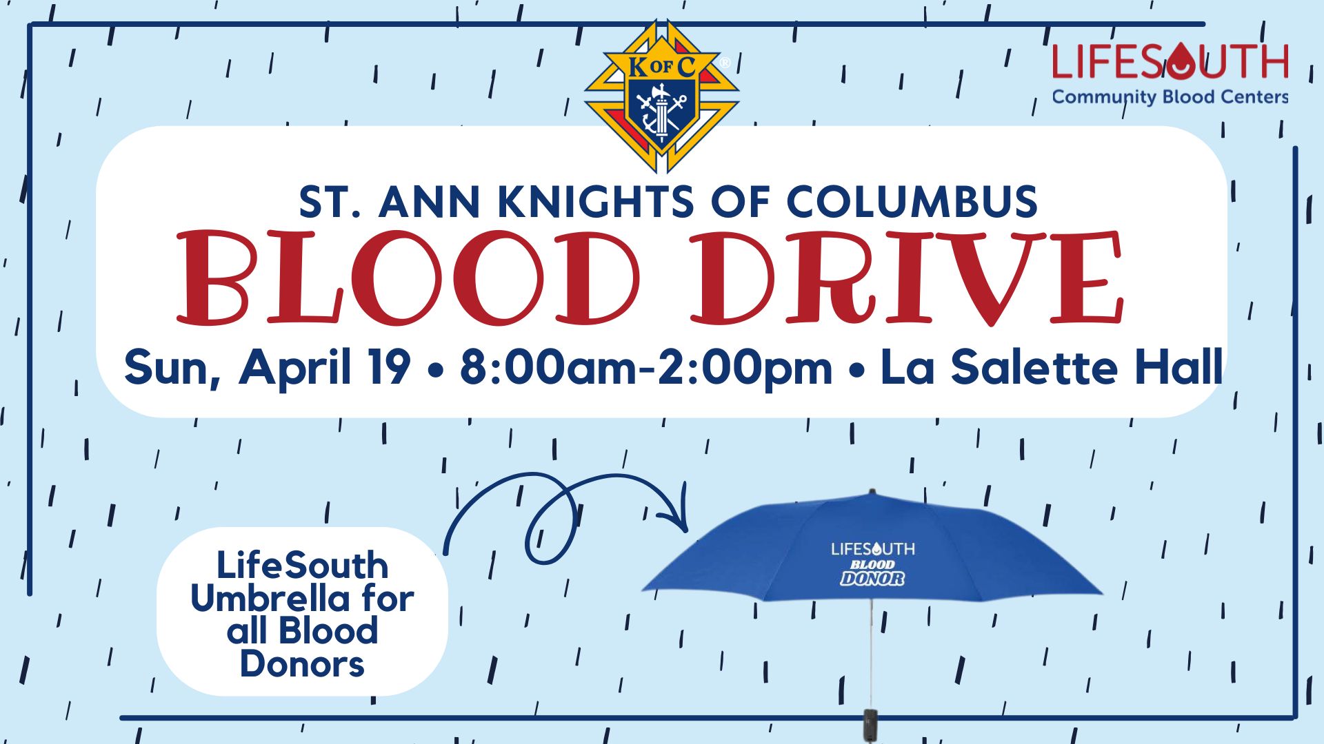 Knights of Columbus is hosting a blood drive on Sunday, April 19th from 8am-2pm in La Salette Hall. All donors will get receive a Life South Umbrella. Sign up here to save lives by donating blood! https://donors.lifesouth.org/donor/schedules/drive_schedule/869786