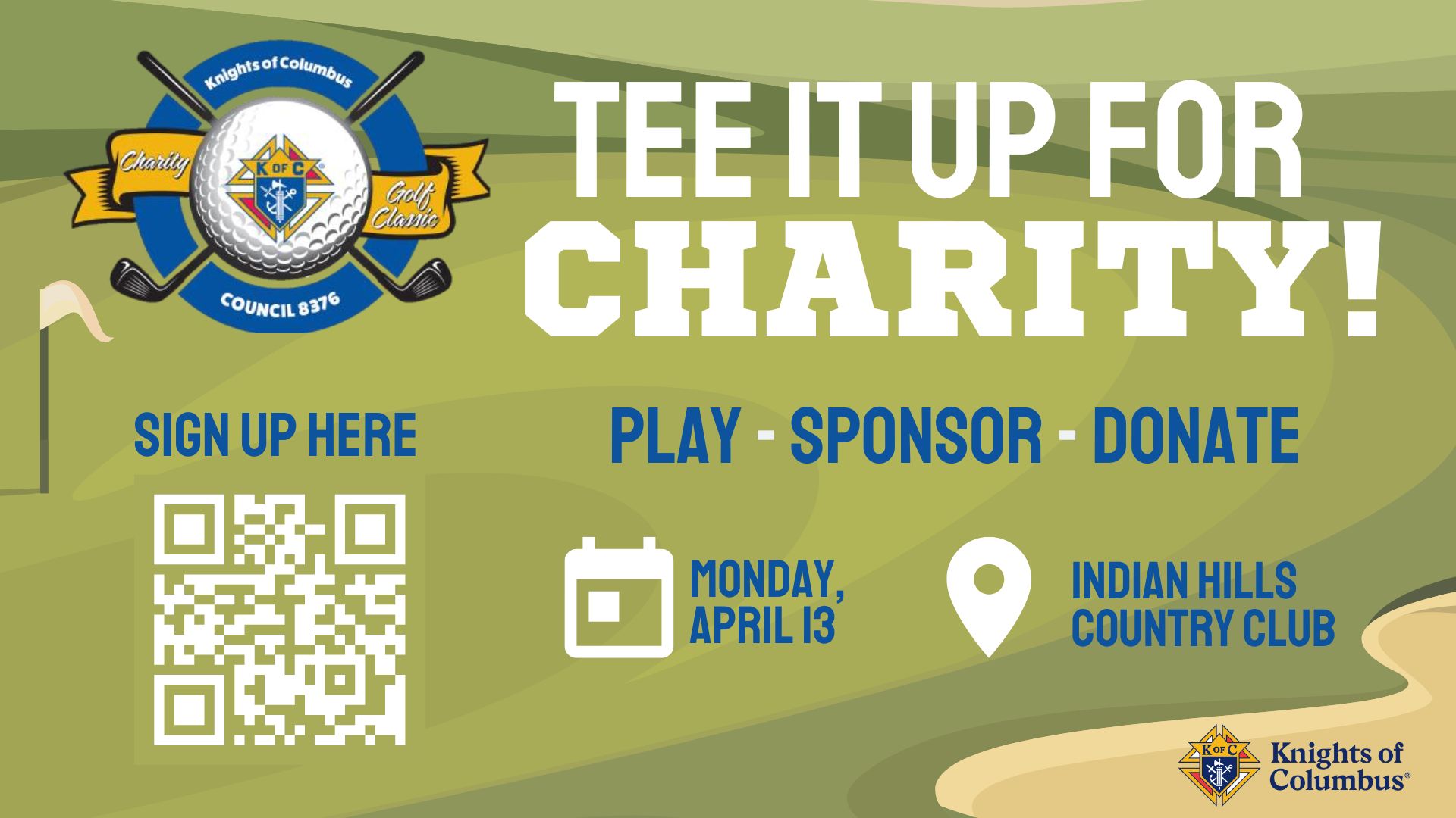 Join the knights of Columbus for the 11th annual Charity Golf Classic. Mark your calendar for April. 13th 2026 at the Indian Hills Country Club to tee it up for charity. Use this link to play, sponsor, or donate! https://birdease.com/33837