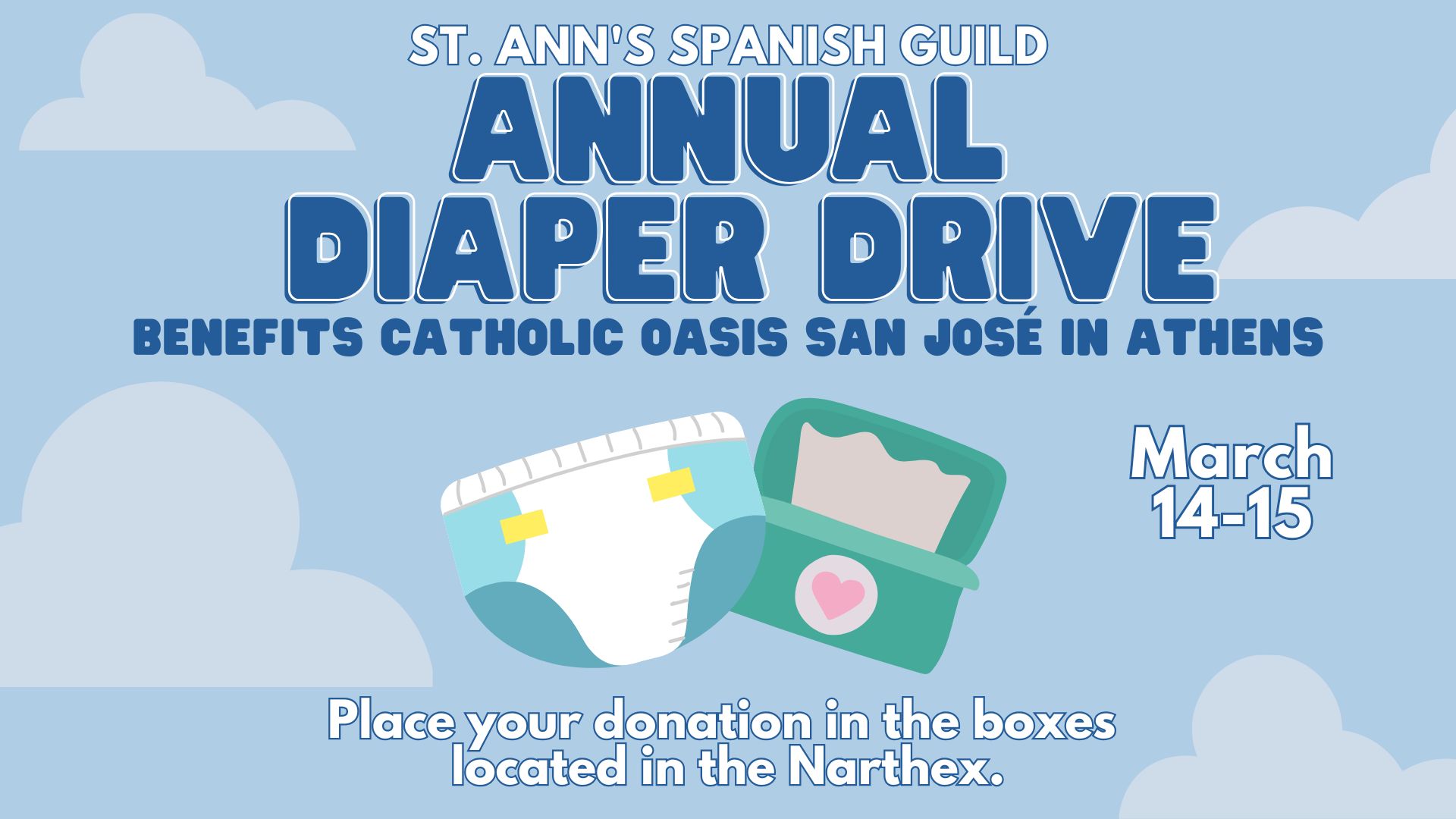 Please help us collect diapers for this community with many needs. Place your donation in the boxes located in the Narthex.
