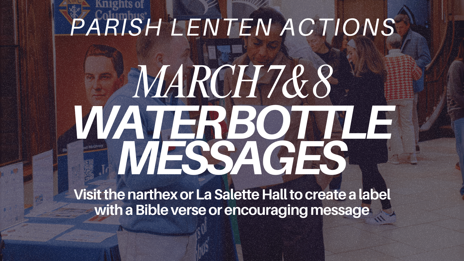 Visit the narthex or La Salette Hall (after morning Masses) to create a label with a Bible verse or encouraging message. These will be attached to water bottles distributed to people experiencing homelessness.