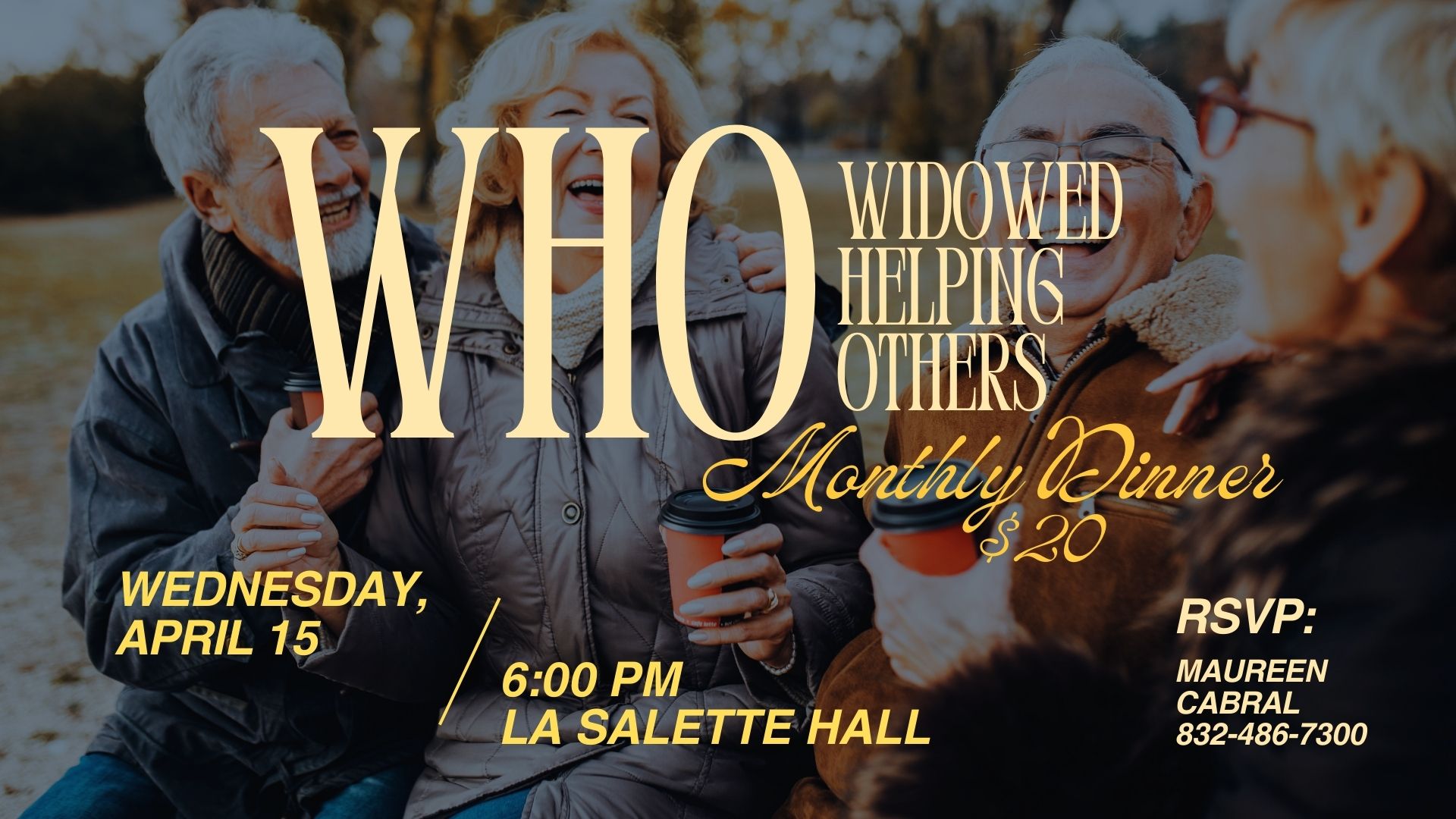 Join us for WHO Widowed Helping Others Monthly Dinner. The cost is $20.00 on Wednesday, April 15 at 6:00 PM La Salette