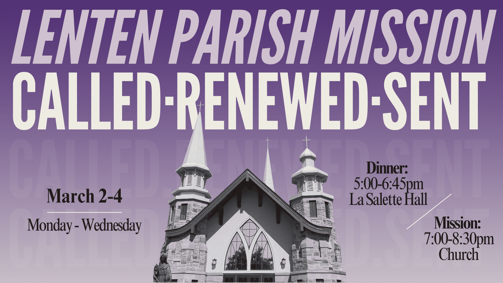 Lenten Parish Mission: Called, Renewed, Sent Mar 3 Lenten Parish Mission: Called, Renewed, Sent 5:00 pm - 8:30 pm Recurring