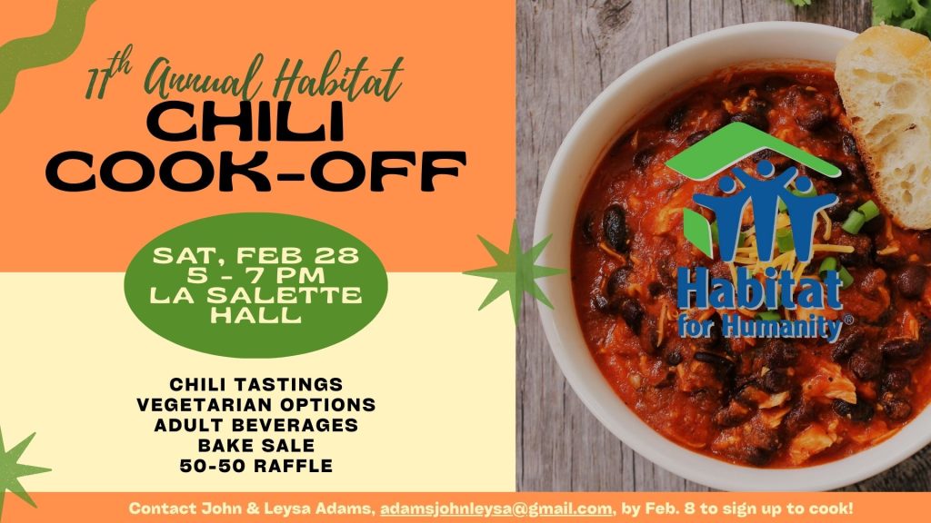 Join us on Saturday, February 28, 5:00pm – 7:00pm in La Salette Hall for the 11th Annual Habitat Chili Cook-Off.