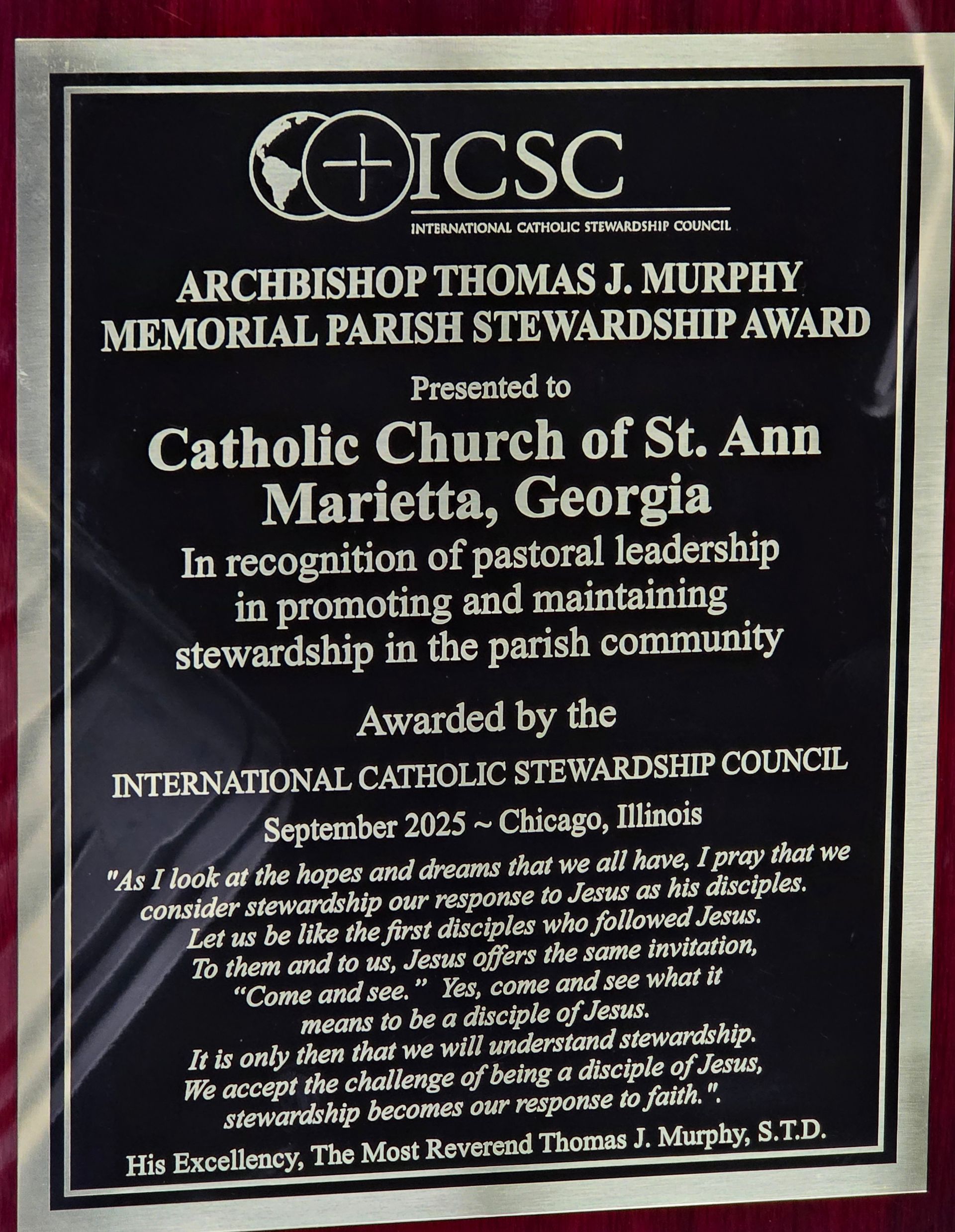 The Catholic Church of St. Ann has been named the 2025 recipient of the Archbishop Thomas Murphy Parish Stewardship Award, presented by the International Catholic Stewardship Council (ICSC). This national award recognizes parishes that exemplify outstanding commitment to Christian stewardship and discipleship.